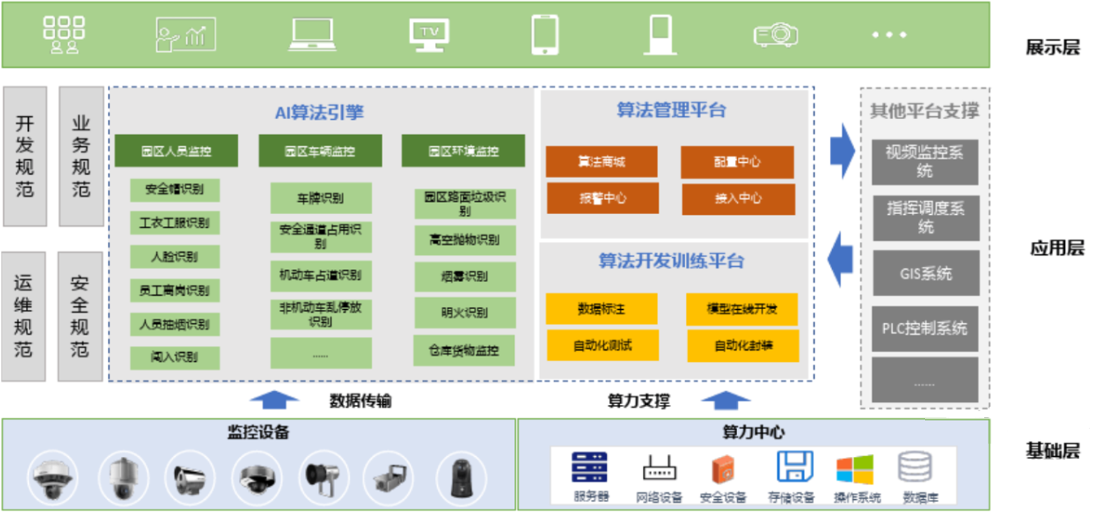 以AI算法平台为中心,基于智慧园区场景,提供定制化视频智能监控解决方案